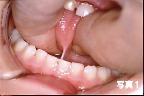 1)舌小帯の異常により、舌の運動が制限され、明らかな発音機能の障害が生じている場合。(舌小帯の異常例、写真1)